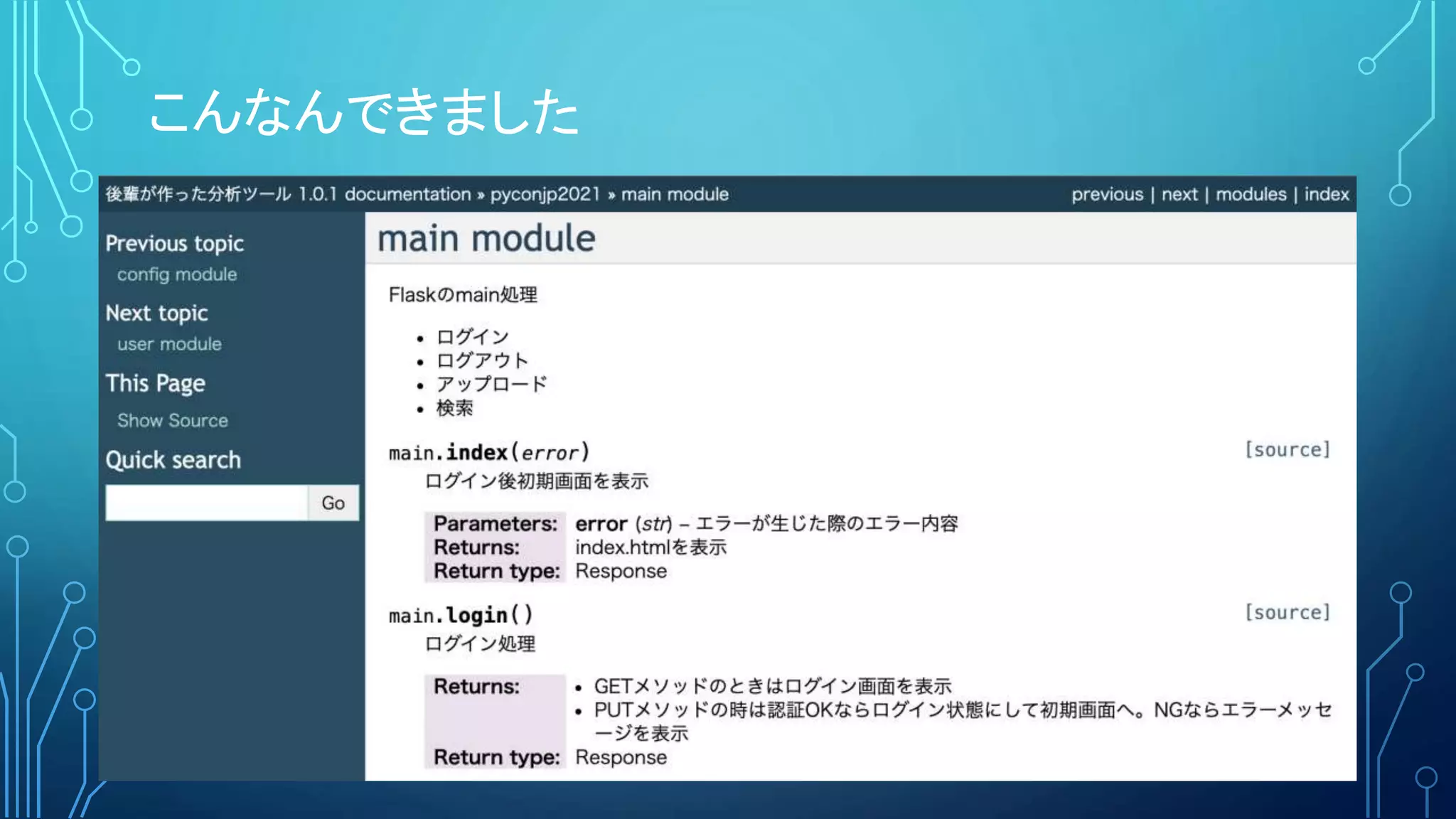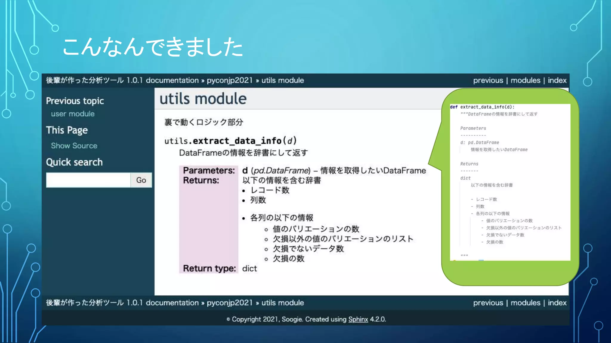 41. 41. その後のSさん(仮名) • テストも書き,リファクタリングも実施 • 何度か機能追加もおこなった • 最新化はmake html一発でOKなのでリファレンスは常に最新 • 新担当者の導入に使用したかったがまずはPython入門からだった • Python Boot Campをもとにアレンジした社内向け初心者講座開講 • また新たな保守対象のコード(docstringなし)が追加され, Sさん(仮名)の戦いは続く