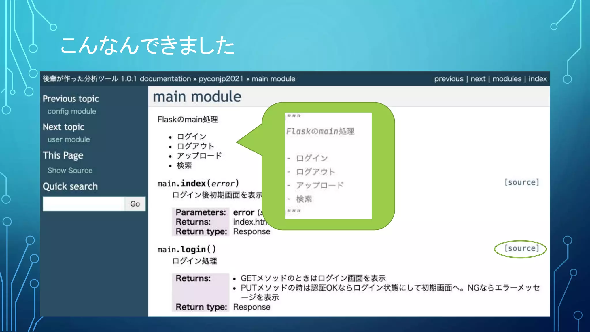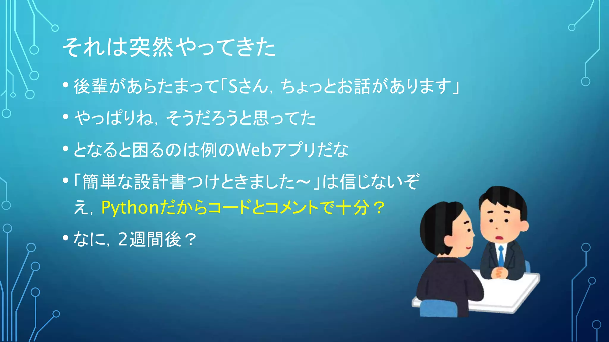 7. 7. それは突然やってきた • 後輩があらたまって「Sさん,ちょっとお話があります」 • やっぱりね,そうだろうと思ってた • となると困るのは例のWebアプリだな • 「簡単な設計書つけときました〜」は信じないぞ え,Pythonだからコードとコメントで十分? • なに,2週間後?