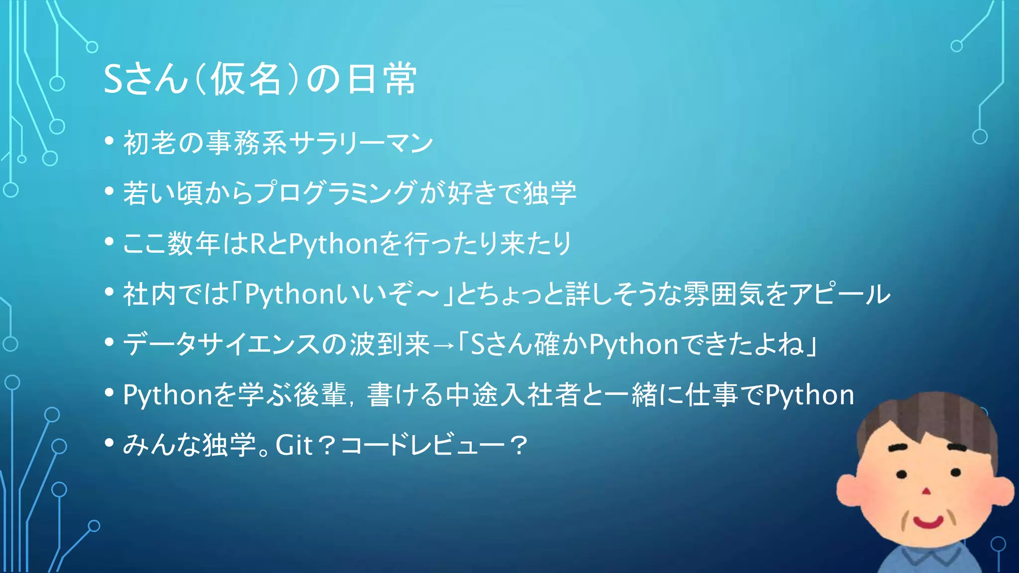 4. 4. Sさん(仮名)の日常 • 初老の事務系サラリーマン • 若い頃からプログラミングが好きで独学 • ここ数年はRとPythonを行ったり来たり • 社内では「Pythonいいぞ〜」とちょっと詳しそうな雰囲気をアピール • データサイエンスの波到来→「Sさん確かPythonできたよね」 • Pythonを学ぶ後輩,書ける中途入社者と一緒に仕事でPython • みんな独学。Git?コードレビュー?