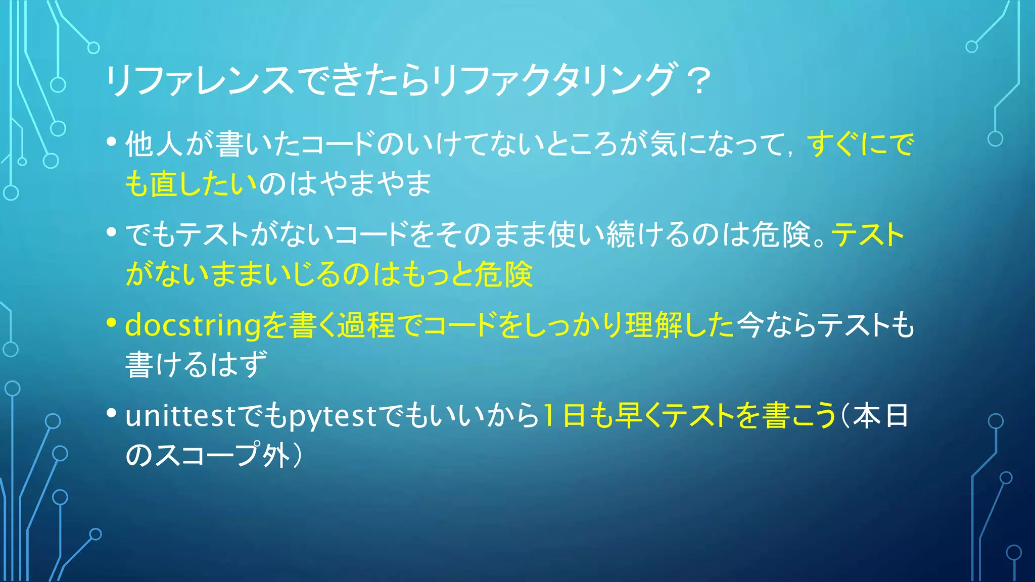40. 40. リファレンスできたらリファクタリング? • 他人が書いたコードのいけてないところが気になって,すぐにで も直したいのはやまやま • でもテストがないコードをそのまま使い続けるのは危険。テスト がないままいじるのはもっと危険 • docstringを書く過程でコードをしっかり理解した今ならテストも 書けるはず • unittestでもpytestでもいいから1日も早くテストを書こう(本日 のスコープ外)