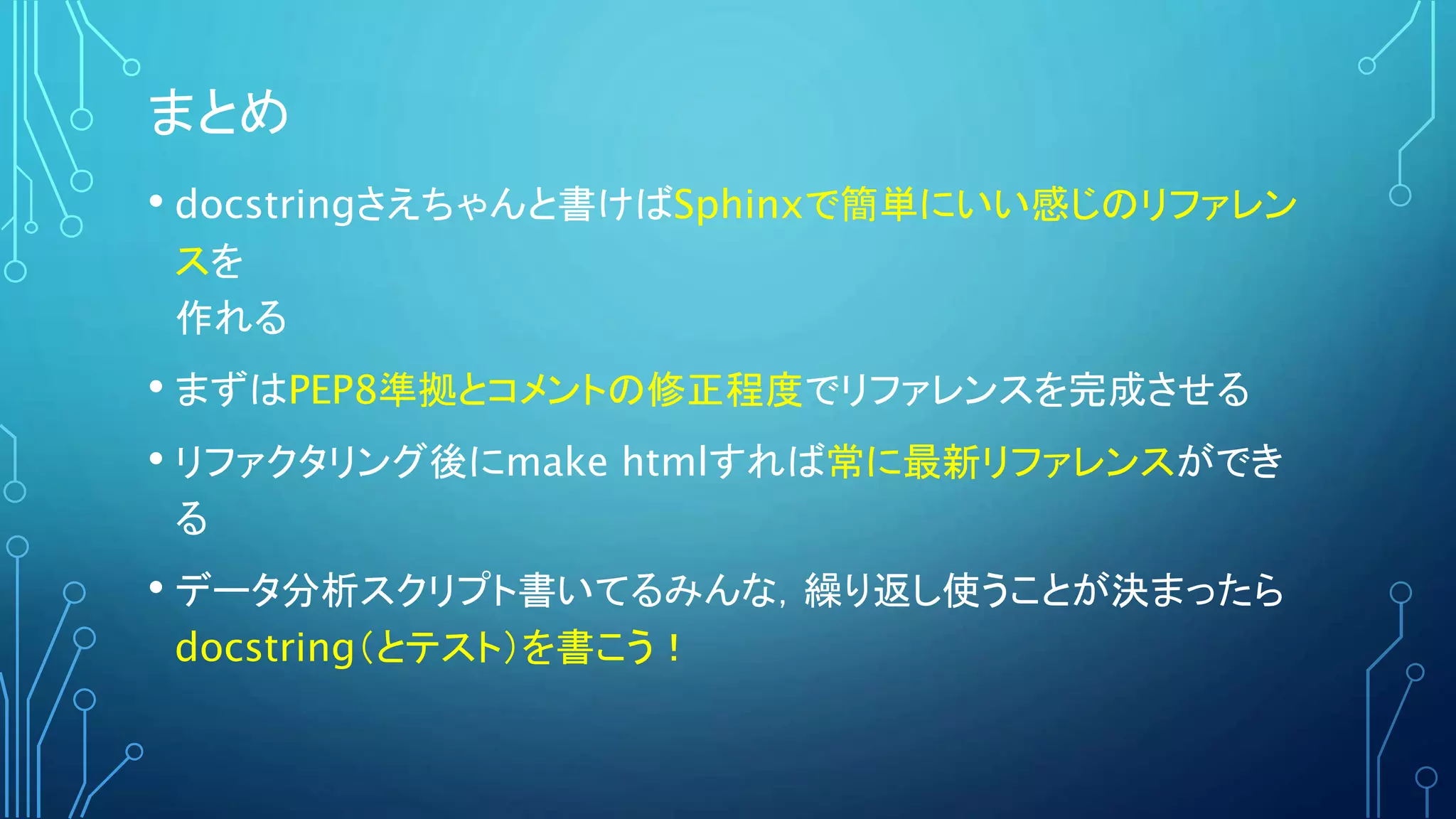 42. 42. まとめ • docstringさえちゃんと書けばSphinxで簡単にいい感じのリファレン スを 作れる • まずはPEP8準拠とコメントの修正程度でリファレンスを完成させる • リファクタリング後にmake htmlすれば常に最新リファレンスができ る • データ分析スクリプト書いてるみんな,繰り返し使うことが決まったら docstring(とテスト)を書こう!