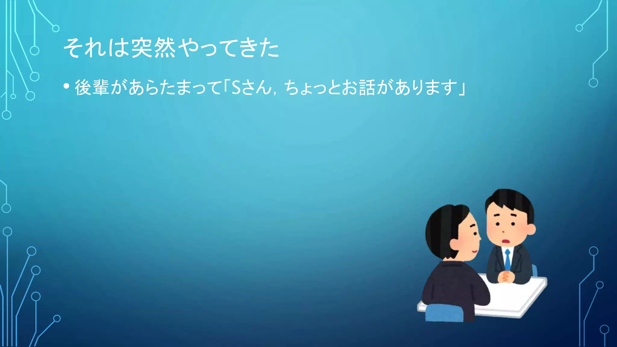 5. 5. それは突然やってきた • 後輩があらたまって「Sさん,ちょっとお話があります」