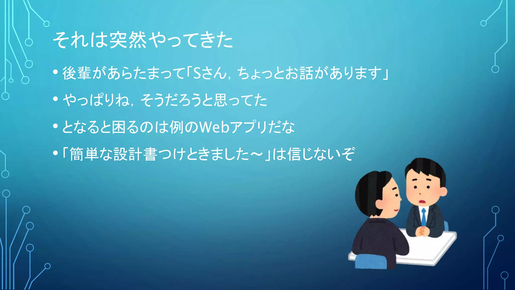6. 6. それは突然やってきた • 後輩があらたまって「Sさん,ちょっとお話があります」 • やっぱりね,そうだろうと思ってた • となると困るのは例のWebアプリだな • 「簡単な設計書つけときました〜」は信じないぞ