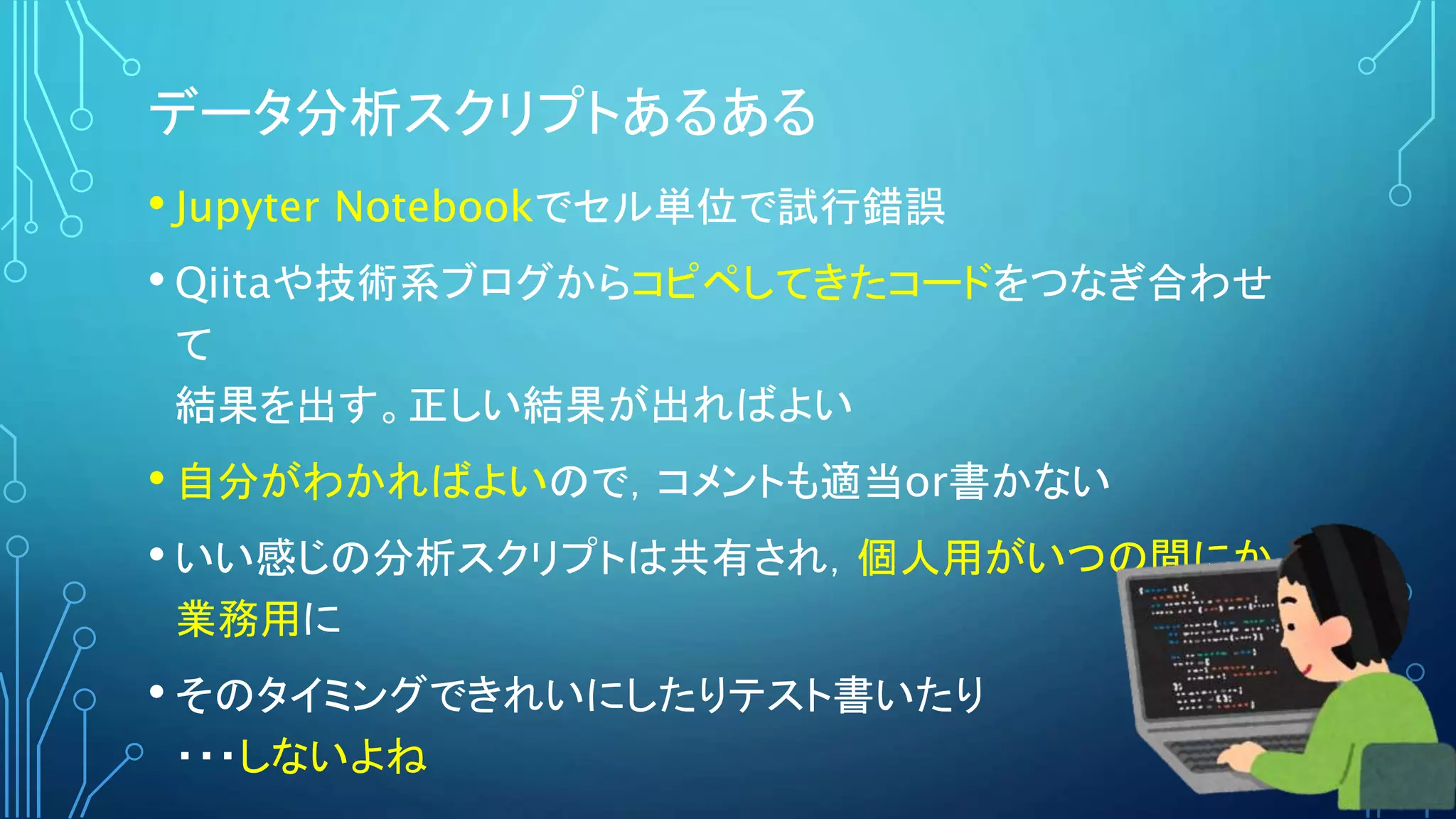 8. 8. データ分析スクリプトあるある • Jupyter Notebookでセル単位で試行錯誤 • Qiitaや技術系ブログからコピペしてきたコードをつなぎ合わせ て 結果を出す。正しい結果が出ればよい • 自分がわかればよいので,コメントも適当or書かない • いい感じの分析スクリプトは共有され,個人用がいつの間にか 業務用に • そのタイミングできれいにしたりテスト書いたり ・・・しないよね