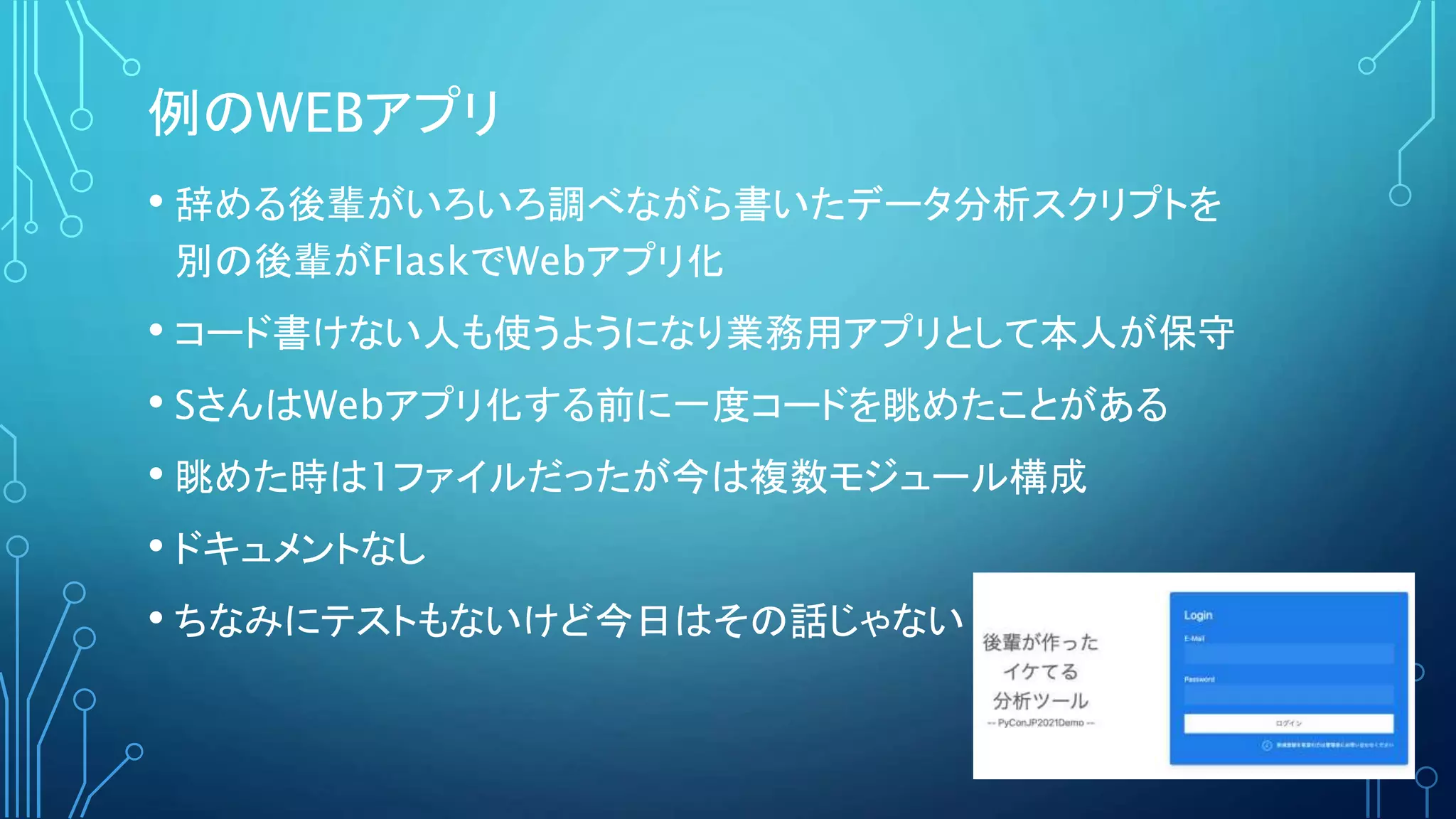 9. 9. 例のWEBアプリ • 辞める後輩がいろいろ調べながら書いたデータ分析スクリプトを 別の後輩がFlaskでWebアプリ化 • コード書けない人も使うようになり業務用アプリとして本人が保守 • SさんはWebアプリ化する前に一度コードを眺めたことがある • 眺めた時は1ファイルだったが今は複数モジュール構成 • ドキュメントなし • ちなみにテストもないけど今日はその話じゃない