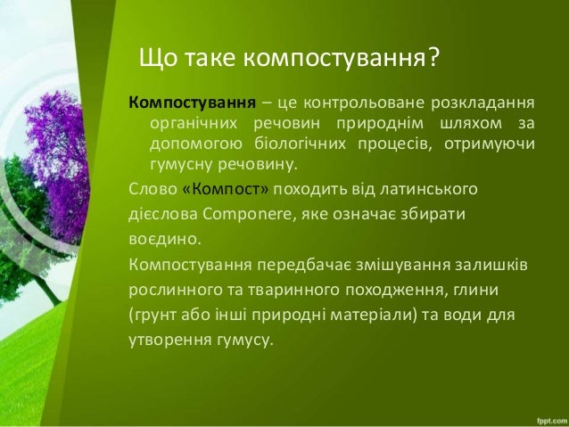 10. 10. Чому компост? Компостування є одним із способів управління переробкою органічних відходів і продукує перегній для покращення ґрунту. Компост покращує родючість ґрунту і сприяє отриманню гарного врожаю. Компостування являється краєугольним каменем скорочення вихідних відходів.