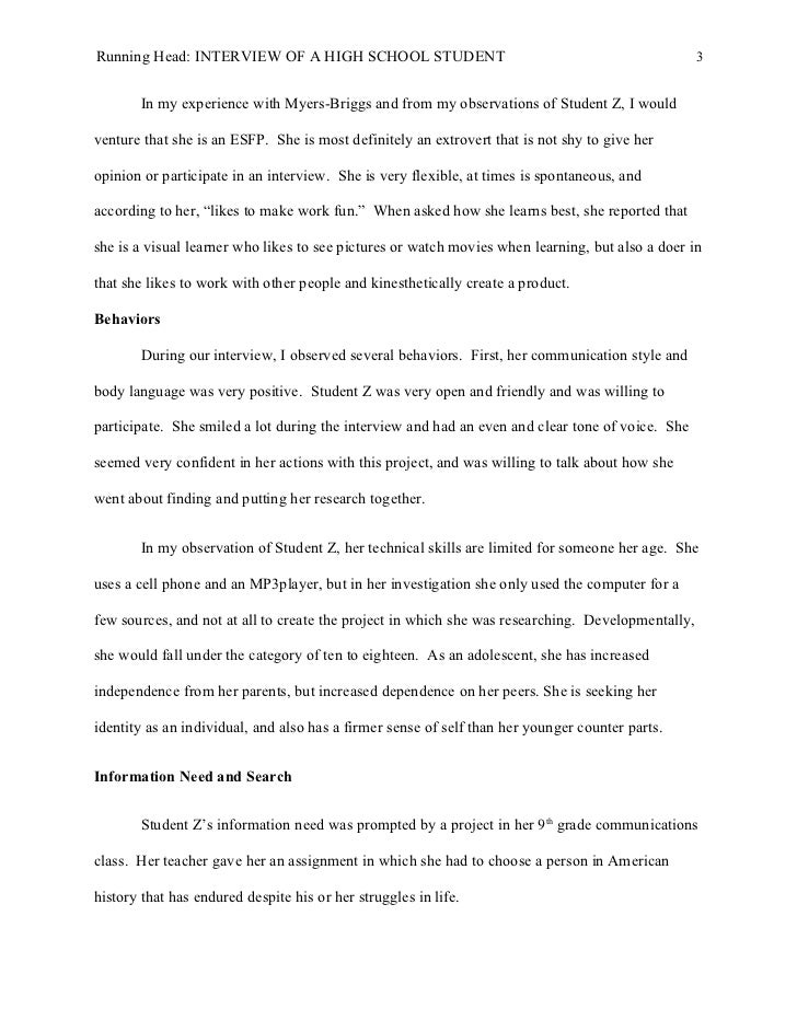 3. 3. Running Head: INTERVIEW OF A HIGH SCHOOL STUDENT 3 In my experience with Myers-Briggs and from my observations of Student Z, I wouldventure that she is an ESFP. She is most definitely an extrovert that is not shy to give heropinion or participate in an interview. She is very flexible, at times is spontaneous, andaccording to her, “likes to make work fun.” When asked how she learns best, she reported thatshe is a visual learner who likes to see pictures or watch movies when learning, but also a doer inthat she likes to work with other people and kinesthetically create a product.Behaviors During our interview, I observed several behaviors. First, her communication style andbody language was very positive. Student Z was very open and friendly and was willing toparticipate. She smiled a lot during the interview and had an even and clear tone of voice. Sheseemed very confident in her actions with this project, and was willing to talk about how shewent about finding and putting her research together. In my observation of Student Z, her technical skills are limited for someone her age. Sheuses a cell phone and an MP3player, but in her investigation she only used the computer for afew sources, and not at all to create the project in which she was researching. Developmentally,she would fall under the category of ten to eighteen. As an adolescent, she has increasedindependence from her parents, but increased dependence on her peers. She is seeking heridentity as an individual, and also has a firmer sense of self than her younger counter parts.Information Need and Search Student Z’s information need was prompted by a project in her 9th grade communicationsclass. Her teacher gave her an assignment in which she had to choose a person in Americanhistory that has endured despite his or her struggles in life.