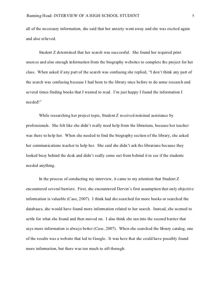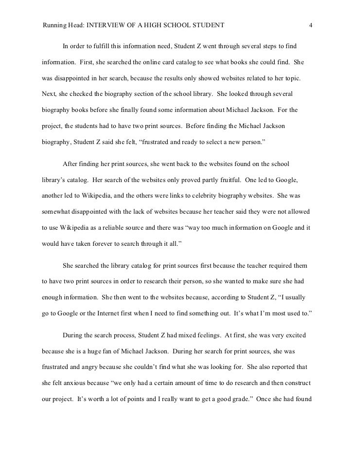 4. 4. Running Head: INTERVIEW OF A HIGH SCHOOL STUDENT 4 In order to fulfill this information need, Student Z went through several steps to findinformation. First, she searched the online card catalog to see what books she could find. Shewas disappointed in her search, because the results only showed websites related to her topic.Next, she checked the biography section of the school library. She looked through severalbiography books before she finally found some information about Michael Jackson. For theproject, the students had to have two print sources. Before finding the Michael Jacksonbiography, Student Z said she felt, “frustrated and ready to select a new person.” After finding her print sources, she went back to the websites found on the schoollibrary’s catalog. Her search of the websites only proved partly fruitful. One led to Google,another led to Wikipedia, and the others were links to celebrity biography websites. She wassomewhat disappointed with the lack of websites because her teacher said they were not allowedto use Wikipedia as a reliable source and there was “way too much information on Google and itwould have taken forever to search through it all.” She searched the library catalog for print sources first because the teacher required themto have two print sources in order to research their person, so she wanted to make sure she hadenough information. She then went to the websites because, according to Student Z, “I usuallygo to Google or the Internet first when I need to find something out. It’s what I’m most used to.” During the search process, Student Z had mixed feelings. At first, she was very excitedbecause she is a huge fan of Michael Jackson. During her search for print sources, she wasfrustrated and angry because she couldn’t find what she was looking for. She also reported thatshe felt anxious because “we only had a certain amount of time to do research and then constructour project. It’s worth a lot of points and I really want to get a good grade.” Once she had found