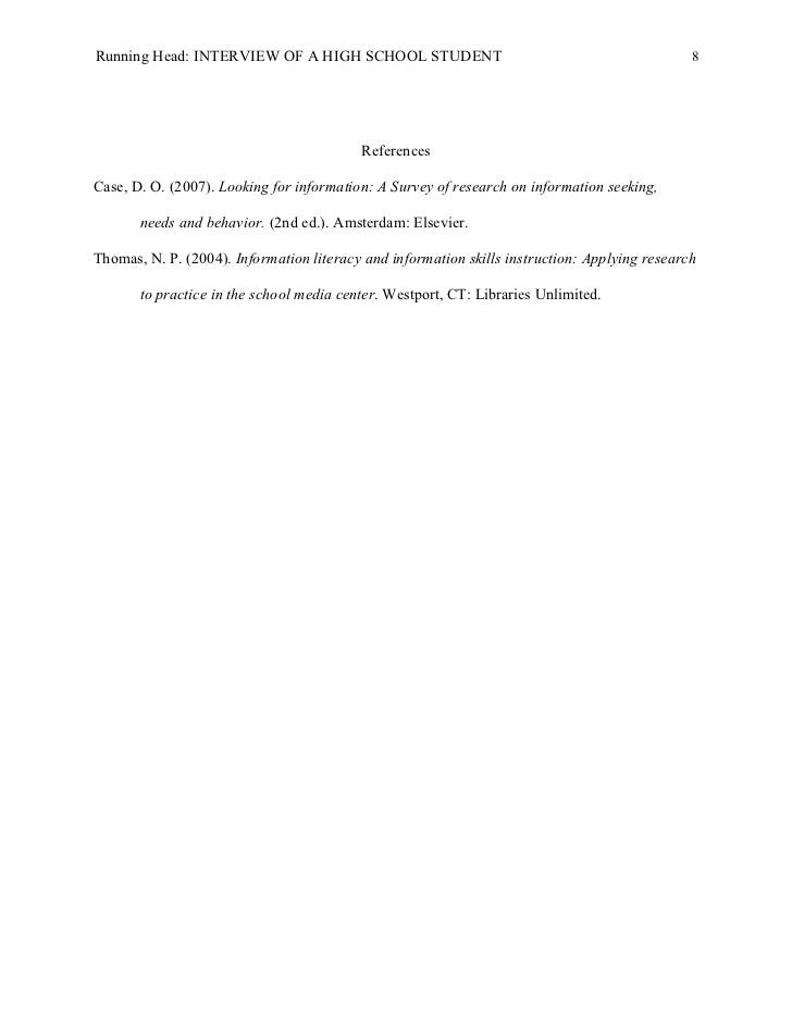 8. 8. Running Head: INTERVIEW OF A HIGH SCHOOL STUDENT 8 ReferencesCase, D. O. (2007). Looking for information: A Survey of research on information seeking, needs and behavior. (2nd ed.). Amsterdam: Elsevier.Thomas, N. P. (2004). Information literacy and information skills instruction: Applying research to practice in the school media center. Westport, CT: Libraries Unlimited.