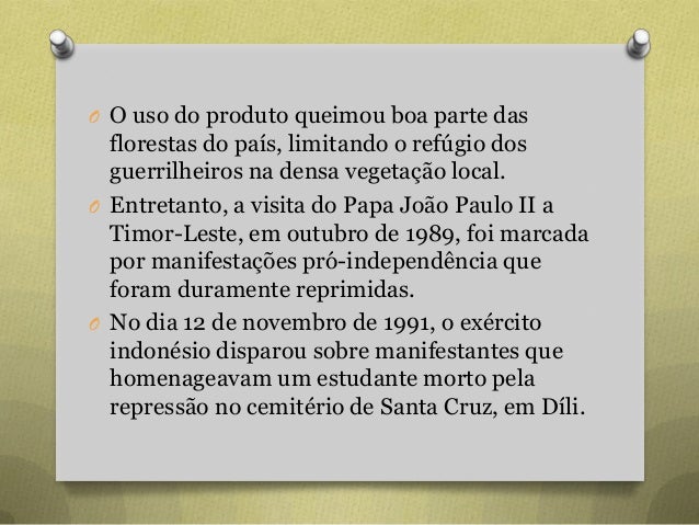 9. 9. O O uso do produto queimou boa parte das florestas do país, limitando o refúgio dos guerrilheiros na densa vegetação local. O Entretanto, a visita do Papa João Paulo II a Timor-Leste, em outubro de 1989, foi marcada por manifestações pró-independência que foram duramente reprimidas. O No dia 12 de novembro de 1991, o exército indonésio disparou sobre manifestantes que homenageavam um estudante morto pela repressão no cemitério de Santa Cruz, em Díli.
