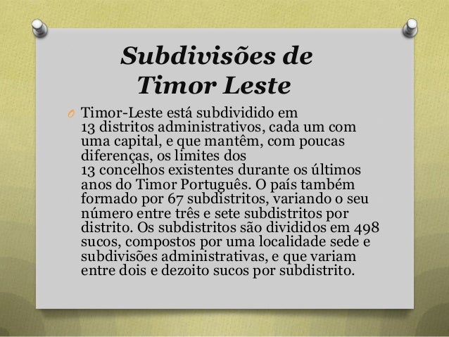 84. 84. Subdivisões de Timor Leste O Timor-Leste está subdividido em 13 distritos administrativos, cada um com uma capital, e que mantêm, com poucas diferenças, os limites dos 13 concelhos existentes durante os últimos anos do Timor Português. O país também formado por 67 subdistritos, variando o seu número entre três e sete subdistritos por distrito. Os subdistritos são divididos em 498 sucos, compostos por uma localidade sede e subdivisões administrativas, e que variam entre dois e dezoito sucos por subdistrito.