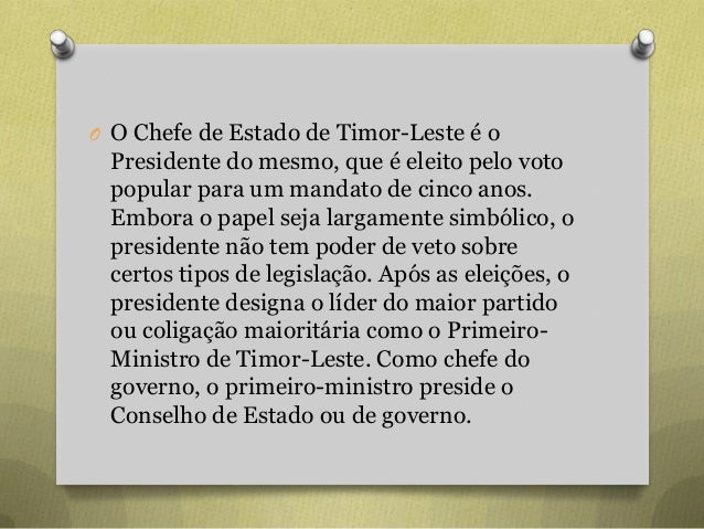 10. 10. O O Chefe de Estado de Timor-Leste é o Presidente do mesmo, que é eleito pelo voto popular para um mandato de cinco anos. Embora o papel seja largamente simbólico, o presidente não tem poder de veto sobre certos tipos de legislação. Após as eleições, o presidente designa o líder do maior partido ou coligação maioritária como o Primeiro- Ministro de Timor-Leste. Como chefe do governo, o primeiro-ministro preside o Conselho de Estado ou de governo.