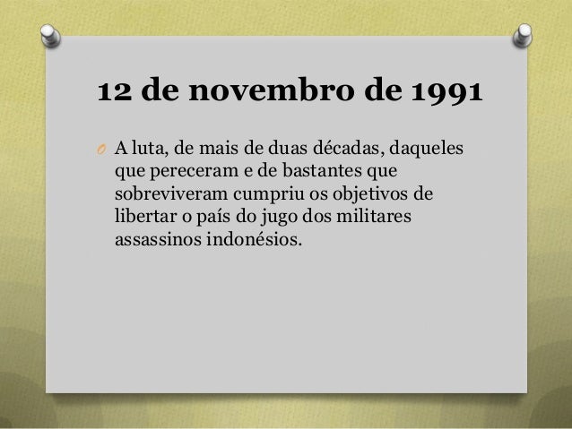 86. 86. 12 de novembro de 1991 O A luta, de mais de duas décadas, daqueles que pereceram e de bastantes que sobreviveram cumpriu os objetivos de libertar o país do jugo dos militares assassinos indonésios.