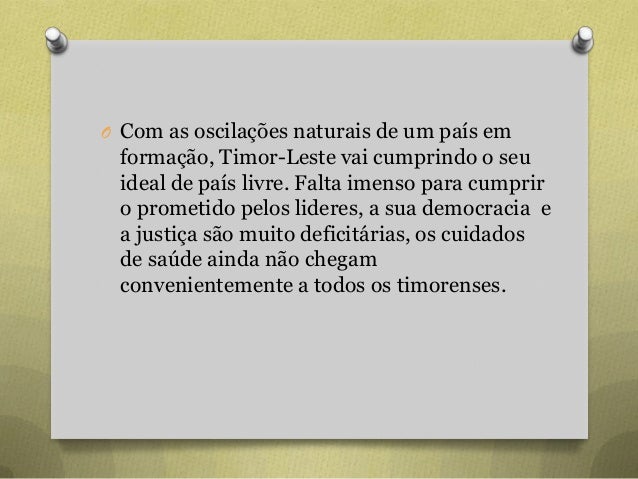 87. 87. O Com as oscilações naturais de um país em formação, Timor-Leste vai cumprindo o seu ideal de país livre. Falta imenso para cumprir o prometido pelos lideres, a sua democracia e a justiça são muito deficitárias, os cuidados de saúde ainda não chegam convenientemente a todos os timorenses.