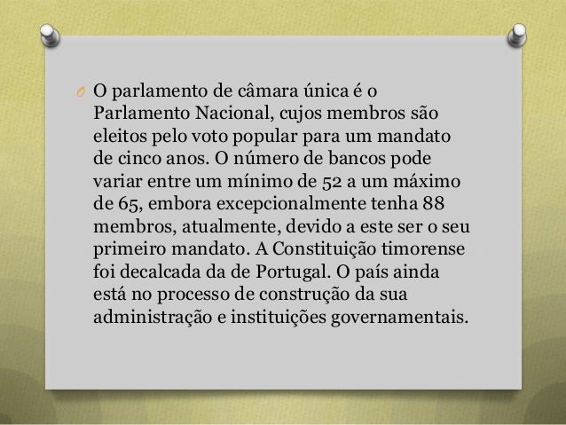11. 11. O O parlamento de câmara única é o Parlamento Nacional, cujos membros são eleitos pelo voto popular para um mandato de cinco anos. O número de bancos pode variar entre um mínimo de 52 a um máximo de 65, embora excepcionalmente tenha 88 membros, atualmente, devido a este ser o seu primeiro mandato. A Constituição timorense foi decalcada da de Portugal. O país ainda está no processo de construção da sua administração e instituições governamentais.