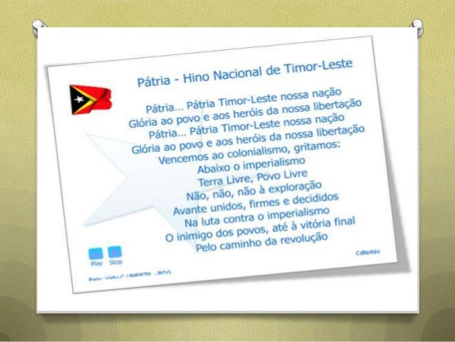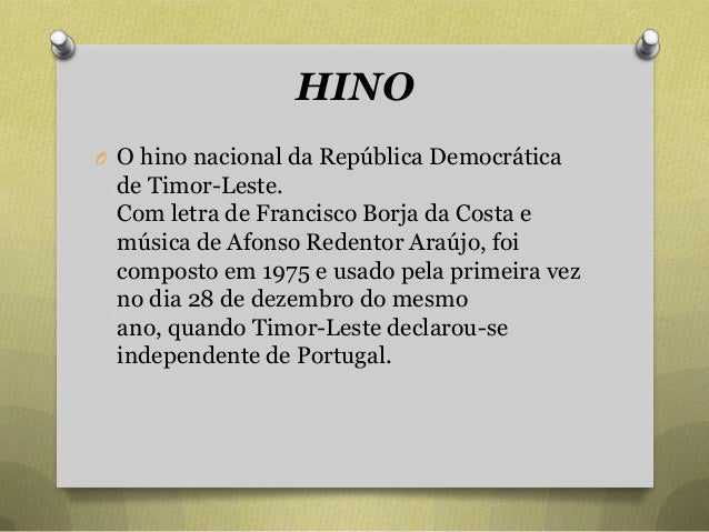 13. 13. HINO O O hino nacional da República Democrática de Timor-Leste. Com letra de Francisco Borja da Costa e música de Afonso Redentor Araújo, foi composto em 1975 e usado pela primeira vez no dia 28 de dezembro do mesmo ano, quando Timor-Leste declarou-se independente de Portugal.