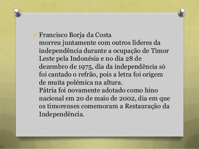 14. 14. O Francisco Borja da Costa morreu juntamente com outros líderes da independência durante a ocupação de Timor Leste pela Indonésia e no dia 28 de dezembro de 1975, dia da independência só foi cantado o refrão, pois a letra foi origem de muita polémica na altura. Pátria foi novamente adotado como hino nacional em 20 de maio de 2002, dia em que os timorenses comemoram a Restauração da Independência.