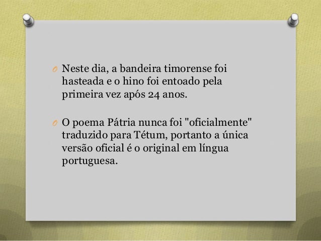 15. 15. O Neste dia, a bandeira timorense foi hasteada e o hino foi entoado pela primeira vez após 24 anos. O O poema Pátria nunca foi "oficialmente" traduzido para Tétum, portanto a única versão oficial é o original em língua portuguesa.