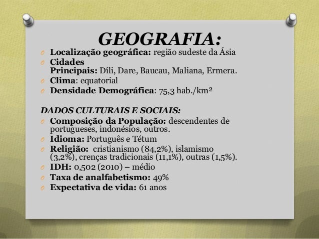 16. 16. GEOGRAFIA: O Localização geográfica: região sudeste da Ásia O Cidades Principais: Díli, Dare, Baucau, Maliana, Ermera. O Clima: equatorial O Densidade Demográfica: 75,3 hab./km² DADOS CULTURAIS E SOCIAIS: O Composição da População: descendentes de portugueses, indonésios, outros. O Idioma: Português e Tétum O Religião: cristianismo (84,2%), islamismo (3,2%), crenças tradicionais (11,1%), outras (1,5%). O IDH: 0,502 (2010) – médio O Taxa de analfabetismo: 49% O Expectativa de vida: 61 anos