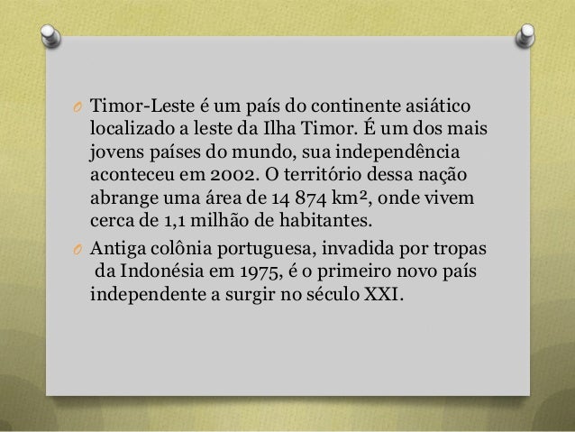 17. 17. O Timor-Leste é um país do continente asiático localizado a leste da Ilha Timor. É um dos mais jovens países do mundo, sua independência aconteceu em 2002. O território dessa nação abrange uma área de 14 874 km², onde vivem cerca de 1,1 milhão de habitantes. O Antiga colônia portuguesa, invadida por tropas da Indonésia em 1975, é o primeiro novo país independente a surgir no século XXI.