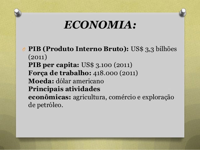 19. 19. ECONOMIA: O PIB (Produto Interno Bruto): US$ 3,3 bilhões (2011) PIB per capita: US$ 3.100 (2011) Força de trabalho: 418.000 (2011) Moeda: dólar americano Principais atividades econômicas: agricultura, comércio e exploração de petróleo.