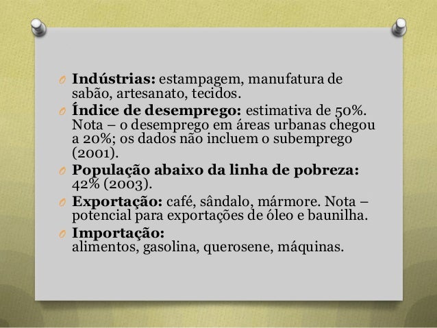 20. 20. O Indústrias: estampagem, manufatura de sabão, artesanato, tecidos. O Índice de desemprego: estimativa de 50%. Nota – o desemprego em áreas urbanas chegou a 20%; os dados não incluem o subemprego (2001). O População abaixo da linha de pobreza: 42% (2003). O Exportação: café, sândalo, mármore. Nota – potencial para exportações de óleo e baunilha. O Importação: alimentos, gasolina, querosene, máquinas.