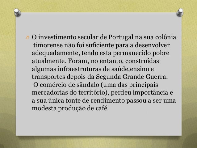 21. 21. O O investimento secular de Portugal na sua colônia timorense não foi suficiente para a desenvolver adequadamente, tendo esta permanecido pobre atualmente. Foram, no entanto, construídas algumas infraestruturas de saúde,ensino e transportes depois da Segunda Grande Guerra. O comércio de sândalo (uma das principais mercadorias do território), perdeu importância e a sua única fonte de rendimento passou a ser uma modesta produção de café.