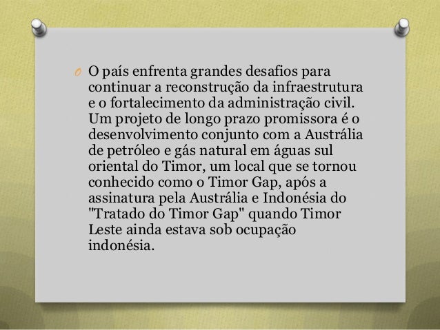 22. 22. O O país enfrenta grandes desafios para continuar a reconstrução da infraestrutura e o fortalecimento da administração civil. Um projeto de longo prazo promissora é o desenvolvimento conjunto com a Austrália de petróleo e gás natural em águas sul oriental do Timor, um local que se tornou conhecido como o Timor Gap, após a assinatura pela Austrália e Indonésia do "Tratado do Timor Gap" quando Timor Leste ainda estava sob ocupação indonésia.