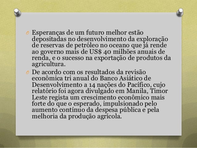 23. 23. O Esperanças de um futuro melhor estão depositadas no desenvolvimento da exploração de reservas de petróleo no oceano que já rende ao governo mais de US$ 40 milhões anuais de renda, e o sucesso na exportação de produtos da agricultura. O De acordo com os resultados da revisão econômica tri anual do Banco Asiático de Desenvolvimento a 14 nações do Pacífico, cujo relatório foi agora divulgado em Manila, Timor Leste regista um crescimento econômico mais forte do que o esperado, impulsionado pelo aumento contínuo da despesa pública e pela melhoria da produção agrícola.