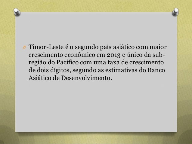 24. 24. O Timor-Leste é o segundo país asiático com maior crescimento econômico em 2013 e único da sub- região do Pacífico com uma taxa de crescimento de dois dígitos, segundo as estimativas do Banco Asiático de Desenvolvimento.