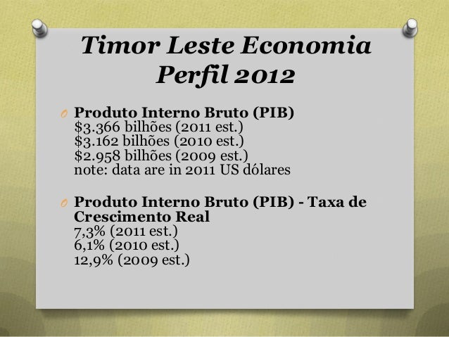 25. 25. Timor Leste Economia Perfil 2012 O Produto Interno Bruto (PIB) $3.366 bilhões (2011 est.) $3.162 bilhões (2010 est.) $2.958 bilhões (2009 est.) note: data are in 2011 US dólares O Produto Interno Bruto (PIB) - Taxa de Crescimento Real 7,3% (2011 est.) 6,1% (2010 est.) 12,9% (2009 est.)