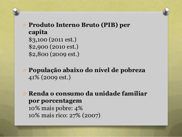 26. 26. O Produto Interno Bruto (PIB) per capita $3,100 (2011 est.) $2,900 (2010 est.) $2,800 (2009 est.) O População abaixo do nível de pobreza 41% (2009 est.) O Renda o consumo da unidade familiar por porcentagem 10% mais pobre: 4% 10% mais rico: 27% (2007)