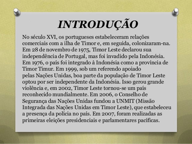 2. 2. INTRODUÇÃO No século XVI, os portugueses estabeleceram relações comerciais com a ilha de Timor e, em seguida, colonizaram-na. Em 28 de novembro de 1975, Timor Leste declarou sua independência de Portugal, mas foi invadido pela Indonésia. Em 1976, o país foi integrado à Indonésia como a província de Timor Timur. Em 1999, sob um referendo apoiado pelas Nações Unidas, boa parte da população de Timor Leste optou por ser independente da Indonésia. Isso gerou grande violência e, em 2002, Timor Leste tornou-se um país reconhecido mundialmente. Em 2006, o Conselho de Segurança das Nações Unidas fundou a UNMIT (Missão Integrada das Nações Unidas em Timor Leste), que estabeleceu a presença da polícia no país. Em 2007, foram realizadas as primeiras eleições presidenciais e parlamentares pacíficas.