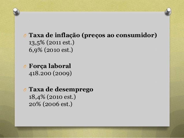 27. 27. O Taxa de inflação (preços ao consumidor) 13,5% (2011 est.) 6,9% (2010 est.) O Força laboral 418.200 (2009) O Taxa de desemprego 18,4% (2010 est.) 20% (2006 est.)