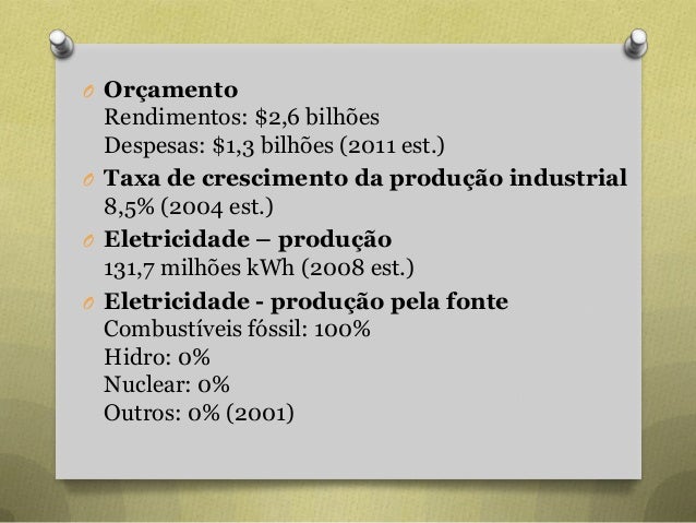 28. 28. O Orçamento Rendimentos: $2,6 bilhões Despesas: $1,3 bilhões (2011 est.) O Taxa de crescimento da produção industrial 8,5% (2004 est.) O Eletricidade – produção 131,7 milhões kWh (2008 est.) O Eletricidade - produção pela fonte Combustíveis fóssil: 100% Hidro: 0% Nuclear: 0% Outros: 0% (2001)