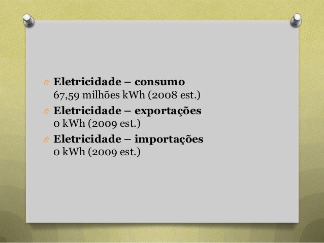 29. 29. O Eletricidade – consumo 67,59 milhões kWh (2008 est.) O Eletricidade – exportações 0 kWh (2009 est.) O Eletricidade – importações 0 kWh (2009 est.)