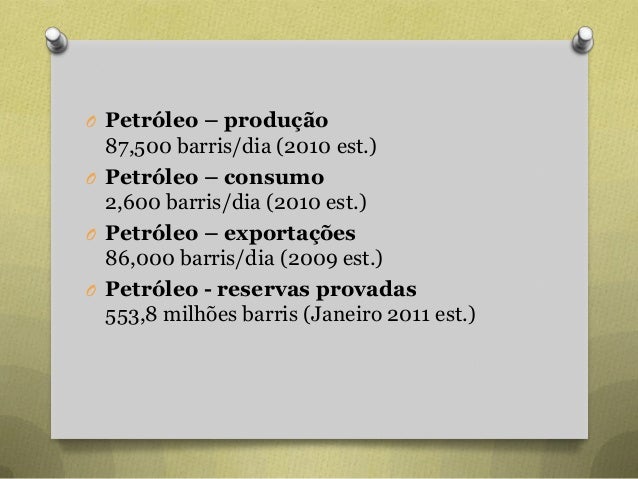 30. 30. O Petróleo – produção 87,500 barris/dia (2010 est.) O Petróleo – consumo 2,600 barris/dia (2010 est.) O Petróleo – exportações 86,000 barris/dia (2009 est.) O Petróleo - reservas provadas 553,8 milhões barris (Janeiro 2011 est.)