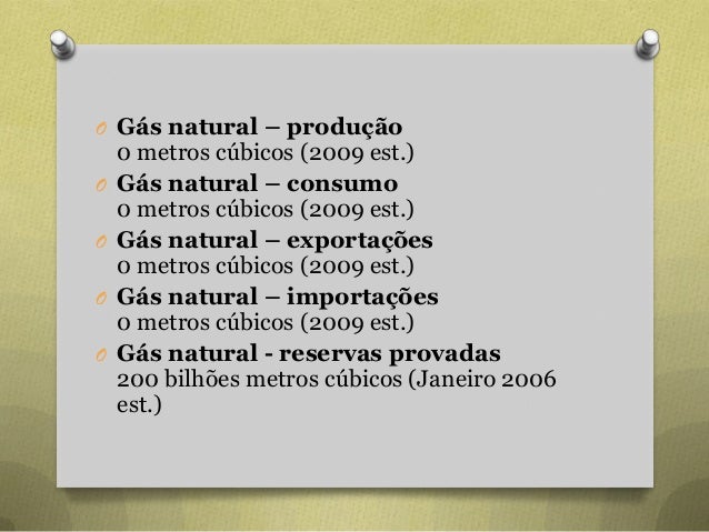 31. 31. O Gás natural – produção 0 metros cúbicos (2009 est.) O Gás natural – consumo 0 metros cúbicos (2009 est.) O Gás natural – exportações 0 metros cúbicos (2009 est.) O Gás natural – importações 0 metros cúbicos (2009 est.) O Gás natural - reservas provadas 200 bilhões metros cúbicos (Janeiro 2006 est.)