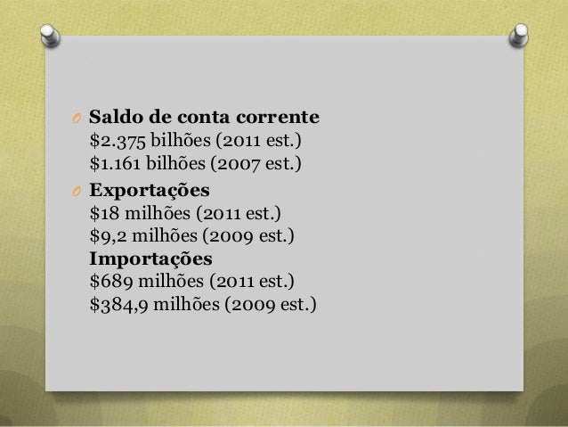 32. 32. O Saldo de conta corrente $2.375 bilhões (2011 est.) $1.161 bilhões (2007 est.) O Exportações $18 milhões (2011 est.) $9,2 milhões (2009 est.) Importações $689 milhões (2011 est.) $384,9 milhões (2009 est.)