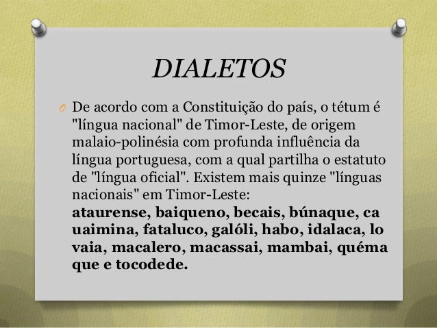 34. 34. DIALETOS O De acordo com a Constituição do país, o tétum é "língua nacional" de Timor-Leste, de origem malaio-polinésia com profunda influência da língua portuguesa, com a qual partilha o estatuto de "língua oficial". Existem mais quinze "línguas nacionais" em Timor-Leste: ataurense, baiqueno, becais, búnaque, ca uaimina, fataluco, galóli, habo, idalaca, lo vaia, macalero, macassai, mambai, quéma que e tocodede.