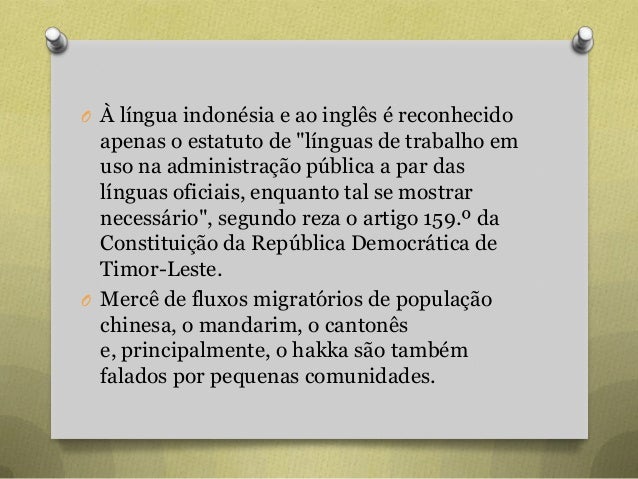 35. 35. O À língua indonésia e ao inglês é reconhecido apenas o estatuto de "línguas de trabalho em uso na administração pública a par das línguas oficiais, enquanto tal se mostrar necessário", segundo reza o artigo 159.º da Constituição da República Democrática de Timor-Leste. O Mercê de fluxos migratórios de população chinesa, o mandarim, o cantonês e, principalmente, o hakka são também falados por pequenas comunidades.