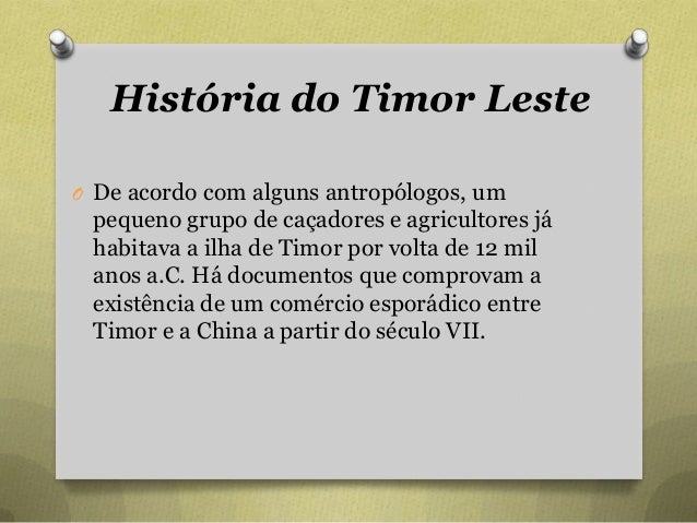 3. 3. História do Timor Leste O De acordo com alguns antropólogos, um pequeno grupo de caçadores e agricultores já habitava a ilha de Timor por volta de 12 mil anos a.C. Há documentos que comprovam a existência de um comércio esporádico entre Timor e a China a partir do século VII.