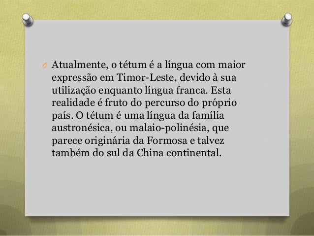 36. 36. O Atualmente, o tétum é a língua com maior expressão em Timor-Leste, devido à sua utilização enquanto língua franca. Esta realidade é fruto do percurso do próprio país. O tétum é uma língua da família austronésica, ou malaio-polinésia, que parece originária da Formosa e talvez também do sul da China continental.