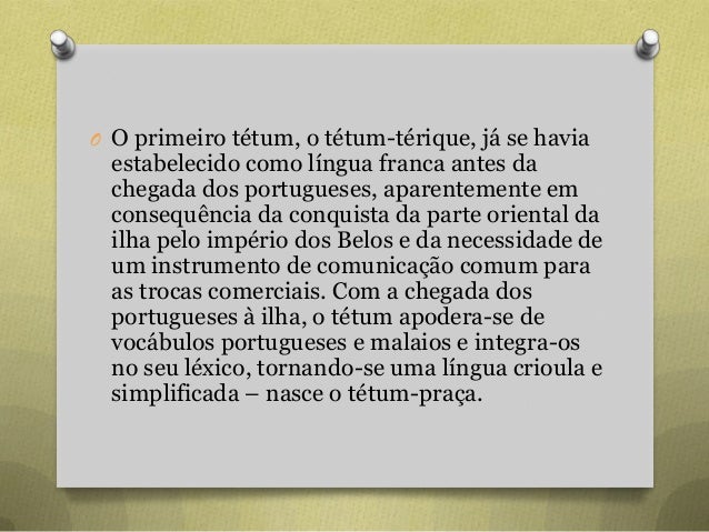 37. 37. O O primeiro tétum, o tétum-térique, já se havia estabelecido como língua franca antes da chegada dos portugueses, aparentemente em consequência da conquista da parte oriental da ilha pelo império dos Belos e da necessidade de um instrumento de comunicação comum para as trocas comerciais. Com a chegada dos portugueses à ilha, o tétum apodera-se de vocábulos portugueses e malaios e integra-os no seu léxico, tornando-se uma língua crioula e simplificada – nasce o tétum-praça.
