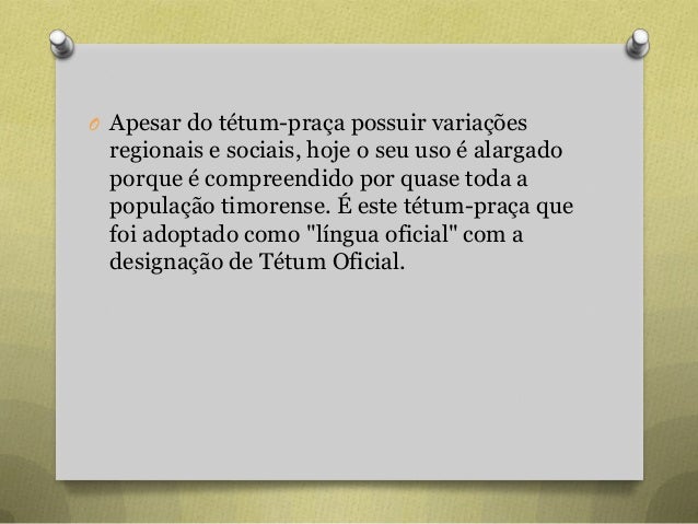 38. 38. O Apesar do tétum-praça possuir variações regionais e sociais, hoje o seu uso é alargado porque é compreendido por quase toda a população timorense. É este tétum-praça que foi adoptado como "língua oficial" com a designação de Tétum Oficial.