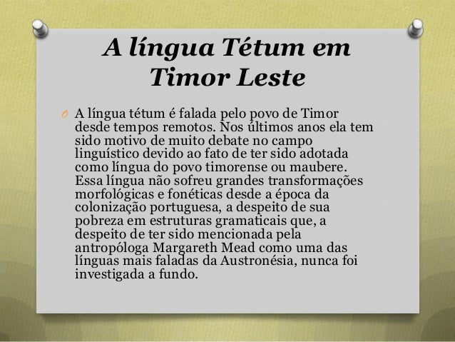 39. 39. A língua Tétum em Timor Leste O A língua tétum é falada pelo povo de Timor desde tempos remotos. Nos últimos anos ela tem sido motivo de muito debate no campo linguístico devido ao fato de ter sido adotada como língua do povo timorense ou maubere. Essa língua não sofreu grandes transformações morfológicas e fonéticas desde a época da colonização portuguesa, a despeito de sua pobreza em estruturas gramaticais que, a despeito de ter sido mencionada pela antropóloga Margareth Mead como uma das línguas mais faladas da Austronésia, nunca foi investigada a fundo.