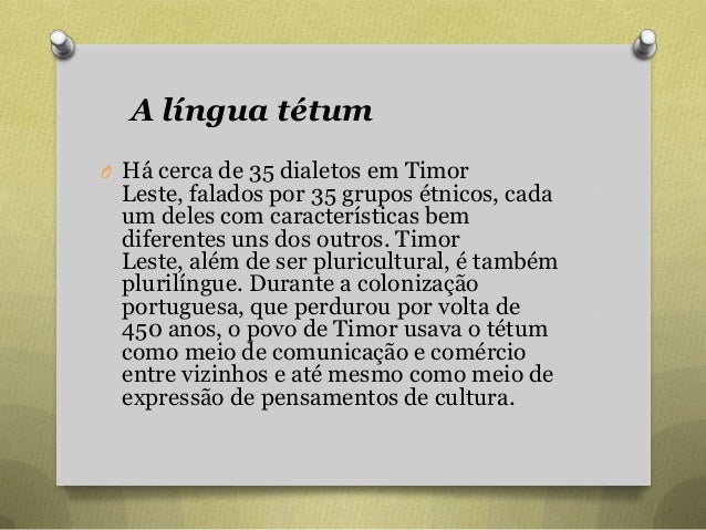 40. 40. A língua tétum O Há cerca de 35 dialetos em Timor Leste, falados por 35 grupos étnicos, cada um deles com características bem diferentes uns dos outros. Timor Leste, além de ser pluricultural, é também plurilíngue. Durante a colonização portuguesa, que perdurou por volta de 450 anos, o povo de Timor usava o tétum como meio de comunicação e comércio entre vizinhos e até mesmo como meio de expressão de pensamentos de cultura.
