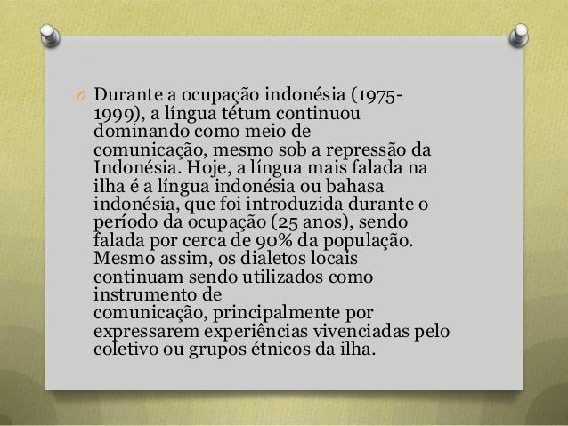 41. 41. O Durante a ocupação indonésia (1975- 1999), a língua tétum continuou dominando como meio de comunicação, mesmo sob a repressão da Indonésia. Hoje, a língua mais falada na ilha é a língua indonésia ou bahasa indonésia, que foi introduzida durante o período da ocupação (25 anos), sendo falada por cerca de 90% da população. Mesmo assim, os dialetos locais continuam sendo utilizados como instrumento de comunicação, principalmente por expressarem experiências vivenciadas pelo coletivo ou grupos étnicos da ilha.