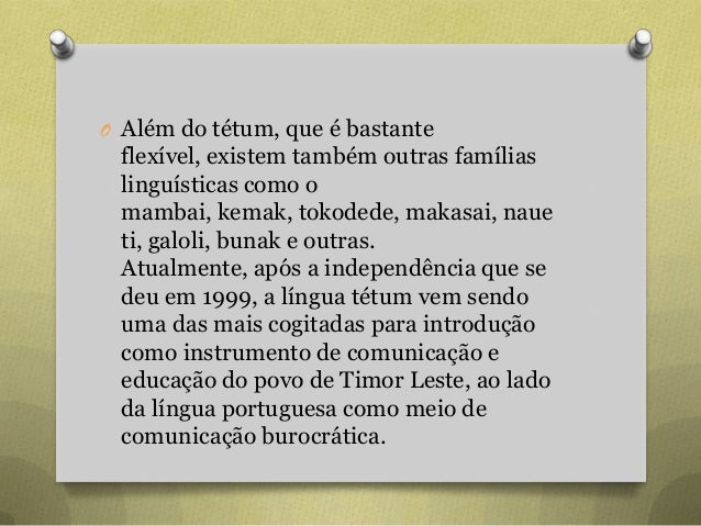 42. 42. O Além do tétum, que é bastante flexível, existem também outras famílias linguísticas como o mambai, kemak, tokodede, makasai, naue ti, galoli, bunak e outras. Atualmente, após a independência que se deu em 1999, a língua tétum vem sendo uma das mais cogitadas para introdução como instrumento de comunicação e educação do povo de Timor Leste, ao lado da língua portuguesa como meio de comunicação burocrática.