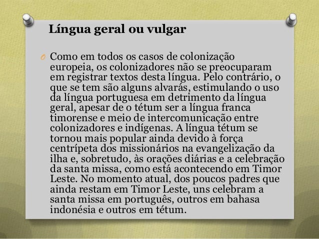 43. 43. Língua geral ou vulgar O Como em todos os casos de colonização europeia, os colonizadores não se preocuparam em registrar textos desta língua. Pelo contrário, o que se tem são alguns alvarás, estimulando o uso da língua portuguesa em detrimento da língua geral, apesar de o tétum ser a língua franca timorense e meio de intercomunicação entre colonizadores e indígenas. A língua tétum se tornou mais popular ainda devido à força centrípeta dos missionários na evangelização da ilha e, sobretudo, às orações diárias e a celebração da santa missa, como está acontecendo em Timor Leste. No momento atual, dos poucos padres que ainda restam em Timor Leste, uns celebram a santa missa em português, outros em bahasa indonésia e outros em tétum.